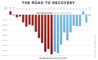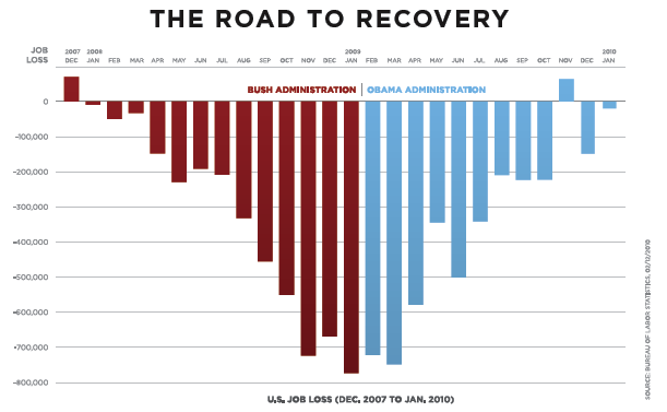 Then there is the “Obama’s recession” refrain. This gets me laughing even harder because of the audacity of the revisionist history. Did not the real estate bubble both inflate and burst while Bush was still in office? The recession officially started in 2008. Obama did not take office until January 2009. (This isn’t to say that it is entirely the Bush Administration’s fault. It’s much more complicated than that.) Given how deep economists have told us this recession is (the largest since the Depression), I think the turn around has been impressive. Within 2 months of Obama’s inauguration, the economy was shrinking at about 6%. However, as of January 2010, the economy was GROWING at 6%. That is a 12% GDP turn-around in less than one year! Any macro-economist will tell you that the unemployment rate is the last economic indicator to recover after a recession. It always follows a stock market and GDP growth rate recovery. We’ve also seen a significant turn around in the stock market from its low in March 2009. It seems as though critics have expected an immediate and complete economic turn around within months; obviously they are using an entirely false standard. While there is ample evidence that things are getting much better, the economy still has a ways to go. An examination of the job loss rate over the past couple of years shows how things are improving. The graph below, from January 2010, shows a marked improvement from 2008. Between January and April of this year, the economy has created 573,000 jobs. While that pales in comparison to the over 8 million jobs lost during this recession, it is a very positive indicator given the trend in the graph below. The proof is in the numbers; we are in a cyclical recovery. What we all need is a little patience as we pull out of the Great Recession.